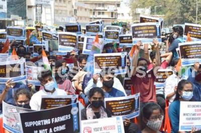 Students and members of NSUI display placards during a protest to condemn the arrest of climate activist Disha Ravi and against the state government demanding the two days holiday before every exam, in Bengaluru on Tuesday 16th February 2021
