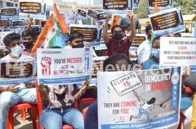 Event Description : Students and members of NSUI display placards during a protest to condemn the arrest of climate activist Disha Ravi and against the state government demanding the two days holiday before every exam, in Bengaluru on Tuesday 16th February 2021