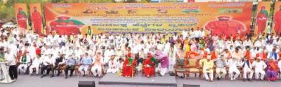 Photo Caption : Sri Jaya Mrityunjaya Swamiji, Sri Vachananda Swamiji, Ministers Murugesh Nirani, CC Patil, MLA Basavanagowda Patil Yatnal and Panchamasali Community leaders during Panchamasali Convention to demanding 2A reservation for Panchamasali community at Palace Grounds, in Bengaluru on Sunday 21st February 2021