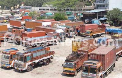 Photo Caption : Trucks are parked at a terminal in Yeshwanthapur during a nationwide strike protest against rising fuel prices and Goods and Service Tax (GST) rules, in Bengaluru on Friday 26th February 2021