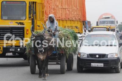 Event Description : An old man riding with grass loaded on a bullock cart to sell in the market, in Bengaluru on Monday 1st March 2021