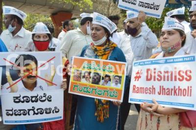 Photo Caption : Members of Aam Aadmi Party protesting against Minister of Water Resources GoK Ramesh Jarkiholi for his alleged sex tape, in Bengaluru on Wednesday 3rd March 2021