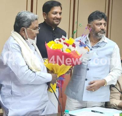 Photo Caption : MLA Sharath Bachegowda being welcomed by CLP leader Siddaramaiah and KPCC President DK Shivakumar during a CLP meeting at Vidhana Soudha, in Bengaluru on Thursday 4th March 2021