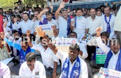 Photo Caption : Members of Karnataka Dalitha Sangarsha Samithi staging a protest at Gandhi Statue, Anand rao Circle, to press their various demands, in Bengaluru on Saturday 6th March 2021
