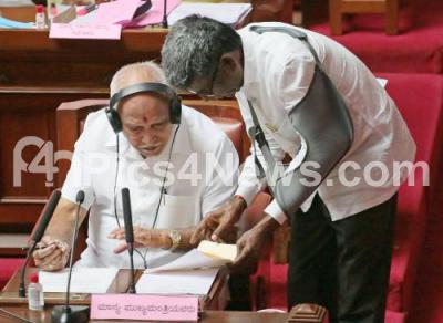 Photo Caption : Chief Minister of Karnataka BS Yediyurappa interacting with Minister Kota Srinivas Poojari during Council Session at Vidhana Soudha, in Bengaluru on Tuesday 9th March 2021