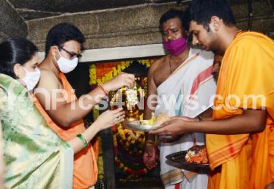 Photo Caption : Yaduveer Krishnadatta Chamaraja Wadiyar , Maharaja of Mysore with wife Trishika performing puja to the gold face mask of lord Shiva at Trineshwaraswamy Temple, on the occasion of Maha Shivaratri festival, in Mysuru on Thursday 11th March 2021