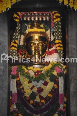 Photo Caption : Priest performing puja to the gold face mask of lord Shiva at Trineshwaraswamy Temple, on the occasion of Maha Shivaratri festival, in Mysuru on Thursday 11th March 2021