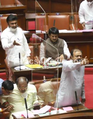 Photo Caption : Ministers Sudhakar and Narayan Gowda addressing during Council Session at Vidhana Soudha, in Bengaluru on Monday 15th March 2021