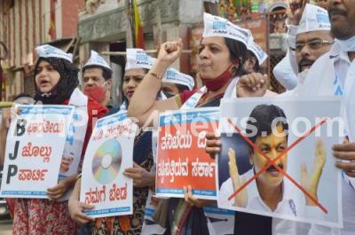 Event Description : Members of Aam Aadmi Party protesting against Former Minister and BJP MLA Ramesh Jarkiholi for his alleged sex tape, in Bengaluru on Wednesday 17th March 2021