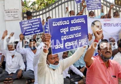 Photo Caption : Members of Karnataka State SC ST contract workers Association staging a protest in front of DCM Govind Karjol official residence to press their various demands, in Bengaluru on Wednesday 24th March 2021