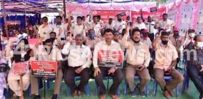 Photo Caption : Members of Bharath Electronics Workers Union staged a protest against privatization of PSUs, in Bengaluru on Thursday 25th March 2021