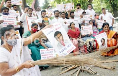 Photo Caption : Members of Bengaluru City Youth Congress protesting against Minister Dr Sudhakar remarks on Karnataka State MLAs, in Bengaluru on Thursday 25th March 2021
