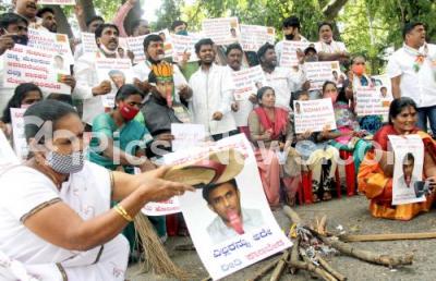 Photo Caption : Members of Bengaluru City Youth Congress protesting against Minister Dr Sudhakar remarks on Karnataka State MLAs, in Bengaluru on Thursday 25th March 2021