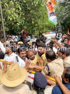 Members of Bengaluru City Youth Congress detained by Cubbon Park police personnel at Cubbon Park during their protesting and demanding to arrest former Minister and Gokak MLA Ramesh Jarkiholi, in Bengaluru on Monday 29th March 2021