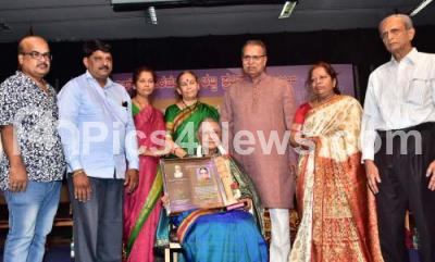 Photo Caption : Writer Neeladevi being presented with Prof SV Parameshwar Bhatt Memorial Award 2021 by Dr KR Sandhya Reddy, Prof BA Vivek Rai and others during a program at Nayana, Kannada Bhavan, in Bengaluru on Monday 29th March 2021