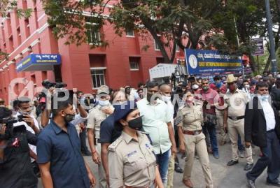 Photo Caption : Police personnel tight security at Magistrate Court following woman in the CD scandal, who will appear in front of the judge, in Bengaluru on Tuesday 30th March 2021