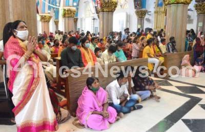 Christian devotees pray on the occasion of Easter at St Mary Basilica Church, Shivajinagar, in Bengaluru on Sunday 4th April 2021