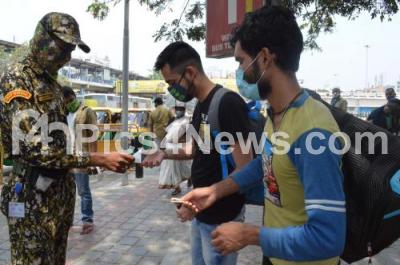 Photo Caption : BBMP Marshals impose fine on public who were not wearing masks at Majestic Bus Stand during Coronavirus pandemic, in Bengaluru on Monday 5th April 2021