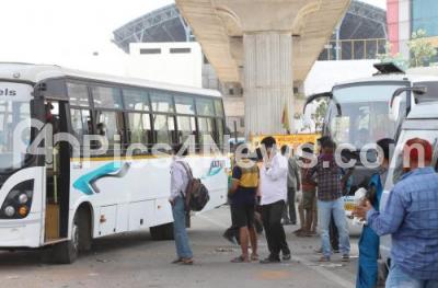 Photo Caption : Commuters travelling in private busses at Kengeri satellite bus stand during the BMTC and KSRTC bus workers indefinite strike from today and to protest against the governments failure to implement a salary under the 6th Pay Commission for the RTC workers, in Bengaluru on Wednesday 7th April 2021