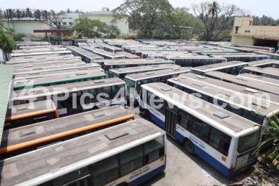 Photo Caption : BMTC busses parked at Kengeri satellite bus stand during the BMTC and KSRTC bus workers indefinite strike from today and to protest against the governments failure to implement a salary under the 6th Pay Commission for the RTC workers, in Bengaluru on Wednesday 7th April 2021