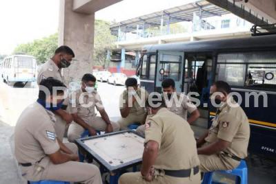 Photo Caption : Police personnel play carom board game at Majestic bus stand during the BMTC and KSRTC bus workers indefinite strike from today and to protest against the governments failure to implement a salary under the 6th Pay Commission for the RTC workers, in Bengaluru on Thursday 8th April 2021