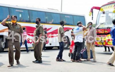 Photo Caption : Some BMTC and KSRTC buses resume service for public with police security during the BMTC and KSRTC bus workers indefinite strike from today and to protest against the governments failure to implement a salary under the 6th Pay Commission for the RTC workers, in Bengaluru on Friday 9th April 2021