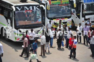 Event Description : Private bus service for public at Majestic bus stand as the BMTC and KSRTC bus workers indefinite strike of road transport corporations (RTC) employees entered its fifth day, in Bengaluru on Sunday 11th April 2021