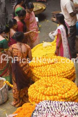 Photo Caption : Less customers at flower market on the occasion of Ugadi festival at KR market during the coronavirus (COVID 19) pandemic, in Bengaluru on Monday 12th April 2021