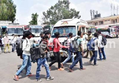 Photo Caption : Private bus service for public at Majestic bus stand as the BMTC and KSRTC bus workers indefinite strike of road transport corporations (RTC) employees entered its 10th day, in Bengaluru on Friday 16th April 2021