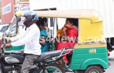People traveling by autorickshaw with no masks and not maintaining social distance at Byadarahalli, Magadi Road during Coronavirus pandemic, in Bengaluru on Saturday 17th April 2021
