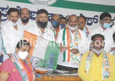 Photo Caption : JDS Former MLA K Raju and his supporters joined Congress party in presence of KPCC President DK Shivakumar at KPCC office, also seen are congress leaders DK Suresh and Balakrishna, in Bengaluru on Sunday 18th April 2021