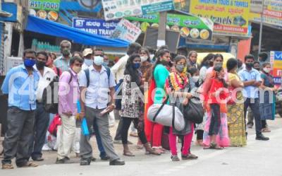 Photo Caption : Commuters stranded at Jalahalli Cross during the BMTC and KSRTC bus workers indefinite strike of road transport corporations (RTC) employees entered its 13th day, in Bengaluru on Monday 19th April 2021