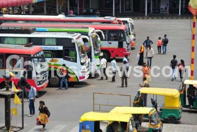 Photo Caption : Some KSRTC buses in service at Majestic bus stand as the BMTC and KSRTC bus workers indefinite strike of road transport corporations (RTC) employees entered its 15th day, in Bengaluru on Wednesday 21st April 2021