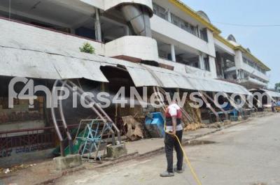 Photo Caption : Workers spray disinfectants at KR Market during the state-wide weekend lockdown in the wake of the 2nd wave of COVID-19 pandemic, in Bengaluru on Saturday 24th April 2021