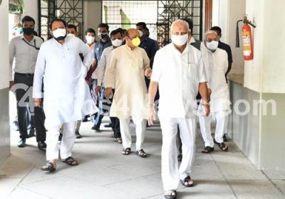 Photo Caption : Chief Minister of Karnataka BS Yediyurappa with DCMs Laxman Savadi, Govind Karjol, Home Minister Basavaraj Bommai and others arriving for a press conference at Vidhana Soudha, in Bengaluru on Monday 26th April 2021