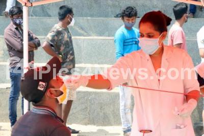 Photo Caption : Health officers collect swab samples for COVID-19 tests amid surge in coronavirus cases at Mallathalli Anganwadi centre, in Bengaluru on Wednesday 28th April 2021