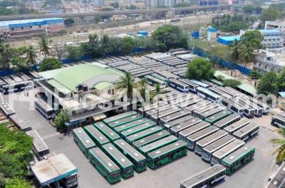 Photo Caption : BMTC buses parked at Yeshwanthpur Bus depot during lockdown in the wake of the 2nd wave of COVID-19, in Bengaluru on Wednesday 28th April 2021