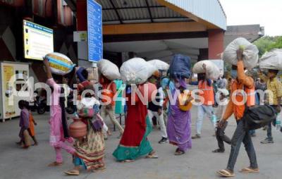 Migrant workers and their family members with their belongings at Bengaluru City Railway station to travel to their native places during Coronavirus lockdown in the wake of the 2nd wave of COVID-19, in Bengaluru on Tuesday 4th May 2021