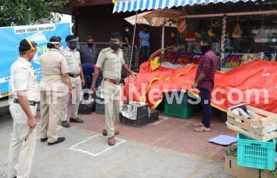 Photo Caption : Police shut down shops at Ullal Main Road, during the 14 day strict state wide lockdown begins in Karnataka today, to contain the spread of Coronavirus , in Bengaluru on Monday 10th May 2021