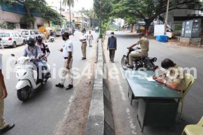 Photo Caption : Police strict checking for people moving at Kamakshipalya Road unnecessarily, during the statewide lockdown, to contain the spread of Coronavirus, in Bengaluru on Wednesday 12th May 2021