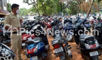 Seized vehicles by the police from the people who were moving around the Bangalore City unnecessarily are parked at a Police Station during Coronavirus lockdown in the wake of the 2nd wave of COVID-19, in Bengaluru on Wednesday 12th May 2021