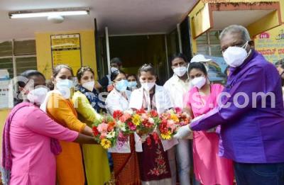 Photo Caption : Corona warriors Doctors and Nurses being felicitated by NS Ravi on the occasion of World Nurse Day at Cox Town, in Bengaluru on Thursday 13th May 2021