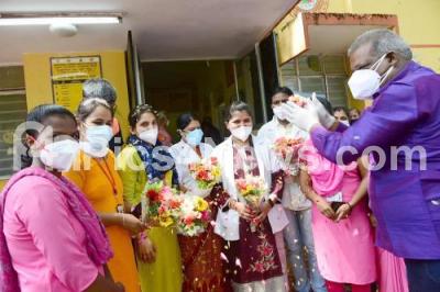 Corona warriors Doctors and Nurses being felicitated by NS Ravi on the occasion of World Nurse Day at Cox Town, in Bengaluru on Thursday 13th May 2021