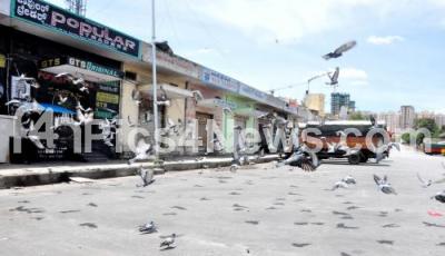 Photo Caption : Flock of pigeons seen taking a flight in front of closed shops at APMC Yard, Yeshwanthapur during lockdown in the wake of the 2nd wave of COVID-19, in Bengaluru on Friday 14th May 2021