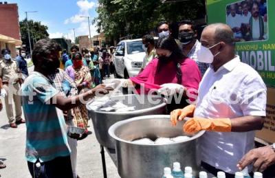 Photo Caption : Volunteers from Appaji canteen distribute food to the needy at KR Market, during the statewide lockdown, to contain the spread of Coronavirus, in Bengaluru on Monday 17th May 2021