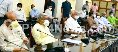 Photo Caption : CM BS Yediyurappa addressing a press conference with DCMs Govind Karjola, Laxman Savadi, Ministers and higher officials at Vidhana Soudha, in Bengaluru on Wednesday 19th May 2021