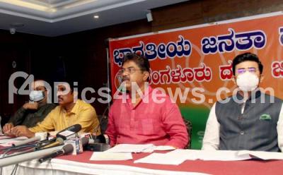 Minister R Ashok addressing a press conference at a private hotel, also seen are MP Tejasvi Surya, MLA Uday Garudachar and BJP leader NR Ramesh, in Bengaluru on Thursday 20th May 2021