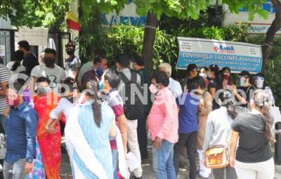 Photo Caption : People waiting outside Kanva private hospital, Rajaji Nagar during COVID-19 vaccination drive, in Bengaluru on Monday 24th May 2021