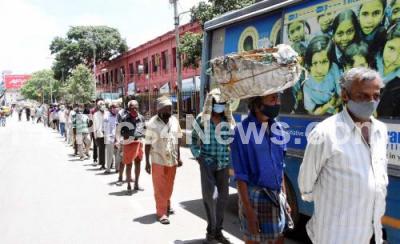 Photo Caption : People standing in a long queue to collect food packets at KR Market during lockdown in the wake of the 2nd wave of COVID-19, in Bengaluru on Sunday 30th May 2021