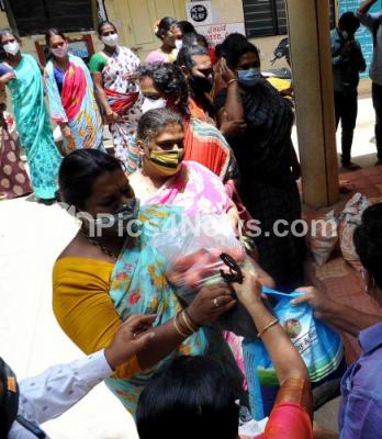 Photo Caption : LGBT community seen standing in queue to collect free ration kits at Rajarajeshwari Nagar during lockdown in the wake of the 2nd wave of COVID-19, in Bengaluru on Sunday 30th May 2021